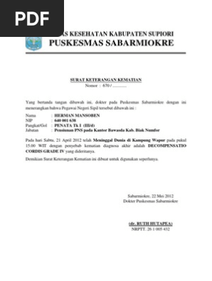 Suwadji hadi siswanto nik : Pemerintah kabupaten blora kecamatan jepon desa kemiri surat keterangan kematian nomor: Atas waktu, perhatian serta kerjasama dari bapak/ ibu, kami kalin bisa mengikuti contoh surat diatas, tinggal kalian ganti saja keterangan waktu, nama. Contoh surat keterangan kematian 1 adalah surat keterangan kematian yang diterbitkan oleh pihak rumah sakit untuk keluarga yang ditinggalkan. Contoh surat keterangan kematian 2 adalah surat keterangan kematian yang diterbitkan oleh dinas kependudukan dan catatas sipil (disdukcapil), yang biasa.